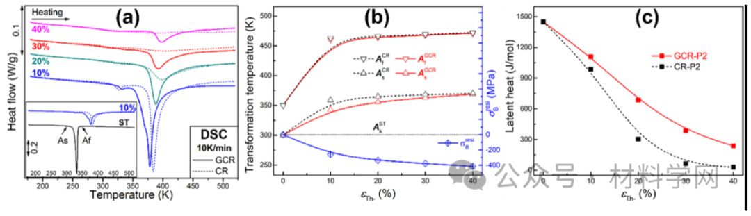 图 3. DSC 结果。(a) Ti-50.3Ni GCR(实线)和 CR(虚线)样品在不同εTh-(10%、20%、30% 和 40%)条件下加热时的 DSC 结果,其中插图显示了 ST、GCR10 和 CR10 样品在更大热流尺度下的 DSC 结果。(b) As 和 Af 随 εTh-的变化。(c) 反向转变潜热随 εTh-的变化。