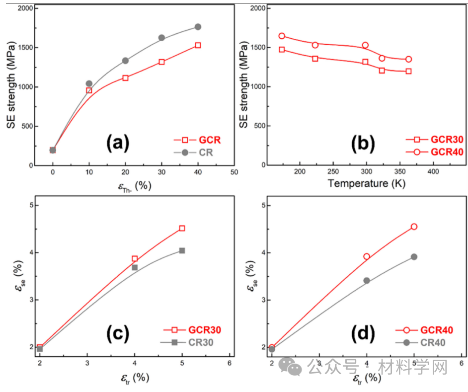 图 7. SE 特性。εtr=5%后,SE强度随轧制变形(a)和温度(b)的变化情况。εTh-为 30 %(c)和 40 %(d)的样品的εse随εtr的变化。