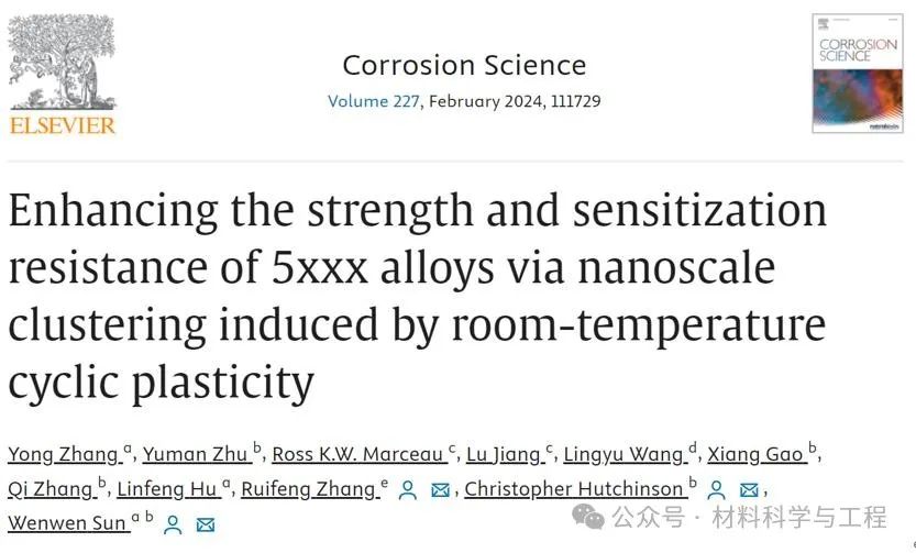 基于上述5xxx系铝合金目前存在的大家普遍关心的重要问题,东南大学材料科学与工程学院孙文文教授团队利用2019年发表在《Science》期刊上的室温循环强化的新加工工艺对5xxx系铝合金中常用的AA5083合金进行处理(点此阅读),该工艺能够应用在5xxx系铝合金上的前提是因为5xxx系铝合金为过饱和固溶体,在室温下Mg的析出具有强烈的热力学驱动力,而通过人工注入空位解决了动力学上原子扩散困难的问题。本工作正是围绕室温循环变形对AA5083合金微观结构的演变、强化机理与腐蚀机理的研究而开展。论文以题为“Enhancing the strength and sensitization resistance of 5xxx alloys via nanoscale clustering induced by room-temperature cyclic plasticity”发表在材料腐蚀领域顶级期刊《Corrosion Science》上。东南大学孙文文教授、澳大利亚Monash大学Christopher Hutchinson教授和中南大学的张瑞丰副教授为本文的通讯作者,东南大学材料科学与工程学院博士生张勇为本文的第一作者。