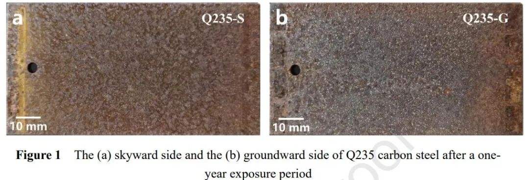 Q235碳钢在暴露1年后的天空(Q235-S)和地面(Q235-G)的腐蚀产物表面宏观特征如图1所示。可以看到样品板的表面呈现出薄而致密的锈层,牢固地粘附在钢基体上,并具有明显的山谷形貌;然而,样品板的两侧存在显著差异,Q235-S的腐蚀更为严重,腐蚀面积更大;相比之下,钢基体在地面侧仍然清晰可见,Q235-G受到的腐蚀较少。塑料夹具对样品板表面施加压力导致塑性变形,由于应力的作用,表面最初出现微裂纹,从而加速了天空侧表面的电化学腐蚀。具体而言,夹具接触区域可能会由于雪或冰的融化和冷凝而长时间保留水膜。这就是为什么在天空侧的塑料夹具接触区域附近有一个明显的凹陷,上面覆盖着“铁黄色”残留物。