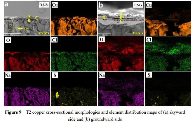 研究人员观察了T2铜在暴露1年后的朝向天空(T2-S)和地面(T2-G)的表面宏观形貌,如图7所示。可以发现两侧的腐蚀产物看起来比较均匀,并表现出明显的双色调层,外层为蓝绿色层,内部为红褐色层。然而,必须承认的是,两侧表面的腐蚀产物表现出异质性。值得注意的是,与T2-S相比,T2-G表现出有更大的表面被蓝绿色腐蚀产物覆盖。这种差异的产生是因为结构稀疏的蓝绿色层在朝向天空一侧比在朝向地面一侧更容易移位,这是由于强风和运输砾石引起的磨蚀作用相当大的影响。此外,无论是在朝向天空侧还是地面侧,夹具接触区域都不存在蓝绿色腐蚀产物。但是,这些产物沿着接触区域的边缘聚集。观察到的现象与在Q235碳钢中观察到的现象形成鲜明对比。这种差异归因于两个主要因素:一是铜的正标准电极电位,二是蓝绿色腐蚀产物的形成。