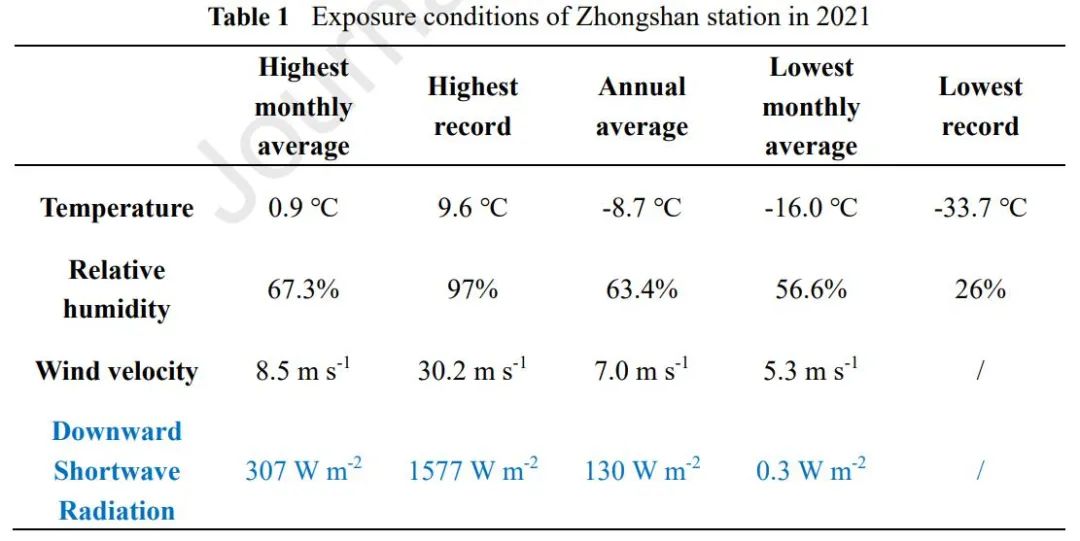 表1列出了南极暴露地点的环境参数。1~12月气温呈谷状波浪状,最低气温出现在5月和6月,最高气温出现在12月和1月。月平均相对湿度往往一直很低,每个月的最高值和最低值之间大约有60%的差异。年平均风速约为7.0 m/s,最大风速在8月达到30.2 m/s。值得注意的是,从5月到7月,短波辐射的检测率极低,但在7月结束后,其强度显著增加。此外,短波辐射的趋势与温度的趋势密切相关,短波辐射强度的下降波动相对较大。