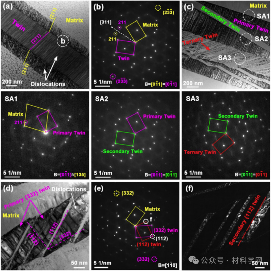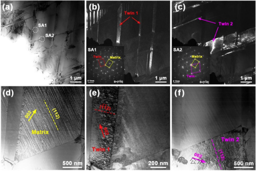 图5 . 77K变形Ti Zr Hf Nb0.5合金中的纳米尺度分级孪晶组织:10 %拉伸应变后孪晶的( a , b) BF图像和对应的SAED花样;( c ) 10 %拉伸应变后,SA1、SA2和SA3区的一次、二次和三元孪晶及其相应的SAED;20 %拉伸应变后二次孪晶的( d-f ) BF图像、SAED和DF图像。