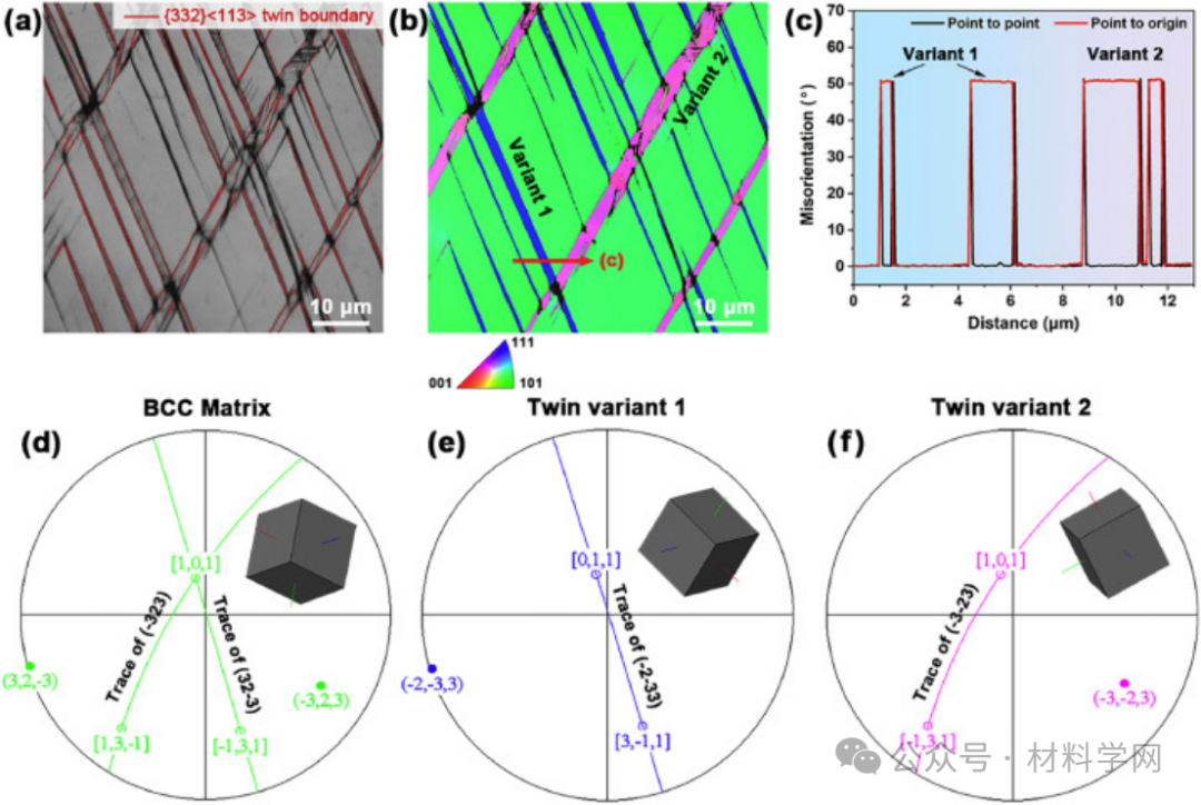 图3 . Ti Zr Hf Nb0.5合金在77K经10 %拉伸应变后的{ 332 }机械孪晶:( a )与{ 332 }孪晶界重叠的带状对比图;( b )逆极图( IPF )显示了两种孪生变体;( c )图2 ( b )中两条孪晶变体沿红线的取向差分布图;BCC矩阵(绿色矩阵)、孪生变体1 (蓝色带)和孪生变体2 (紫色带)的( d-f )极图。