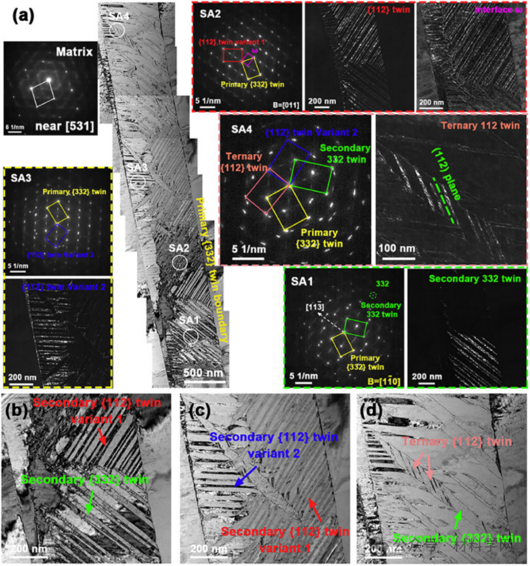 图6 . 77K下10 %拉伸变形Ti Zr Hf Nb0.5合金中多级孪晶的复杂程度:( a )初生孪晶的BF和SA1、SA2、SA3、SA4区域的SAED,并附有相应的DF图像;二次孪晶、二次变体1、二次变体2和三元孪晶的( b-d )放大图像。