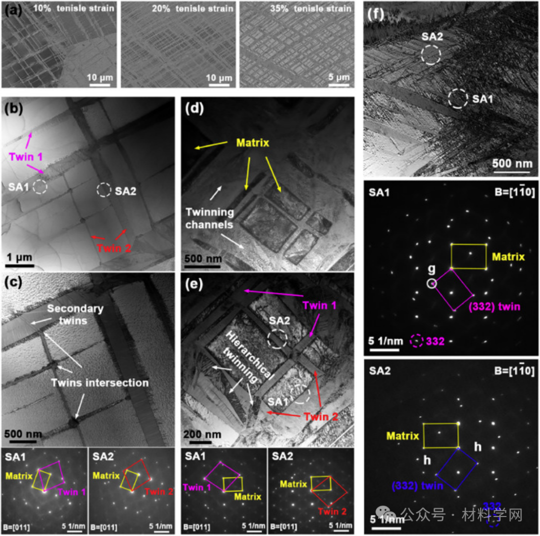 图7 . 77 K变形Ti Zr Hf Nb0.5合金中孪晶交汇:( a ) 10 %、20 %和35 %拉伸应变后的变形亚结构演变;( b-e )孪晶分别在10 %和35 %拉伸应变后沿孪晶轴发生交叉;( f )为沿孪晶轴拉伸应变20 %后相交的孪晶。