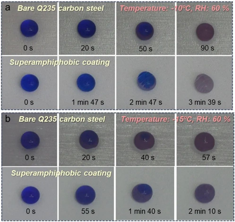 -10℃和-15℃低温环境下的结冰测试也进一步揭示了涂层具有显著的延迟结冰和降低界面冰粘附力特性。