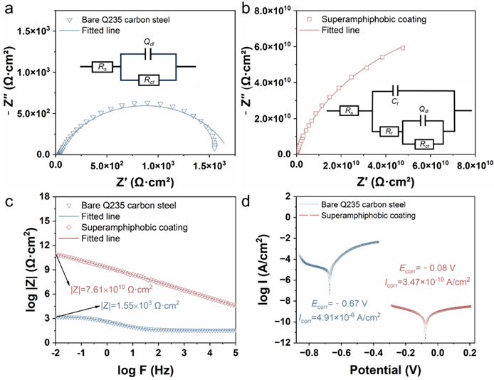 研究结果发现所制备的超双疏自清洁涂层对不同表面张力的液体均展现出优异的斥液性和液体无损传输功能。电化学测试结果显示涂层表面电荷转移电阻较空白碳钢基体提升8个数量级、腐蚀电位正移590 mV、腐蚀电流下降4个数量级。
