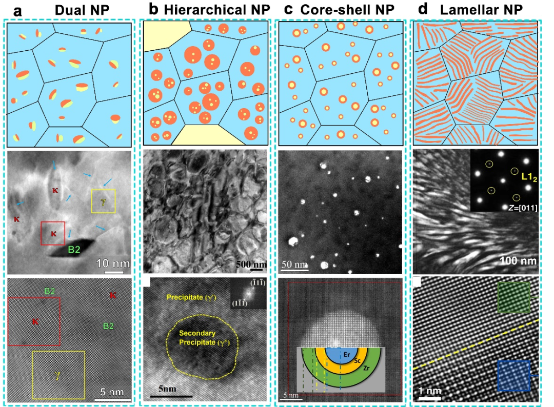 图9 金属材料中不同类型的共格纳米析出相形貌 (a) 可剪切的 κ-碳化物和不可剪切的 B2相的密集拓扑共析出; (b) 具有多级结构的共格纳米析出相;(c) 核壳结构的共格纳米析出相;(d) 层状结构的共格纳米析出相。