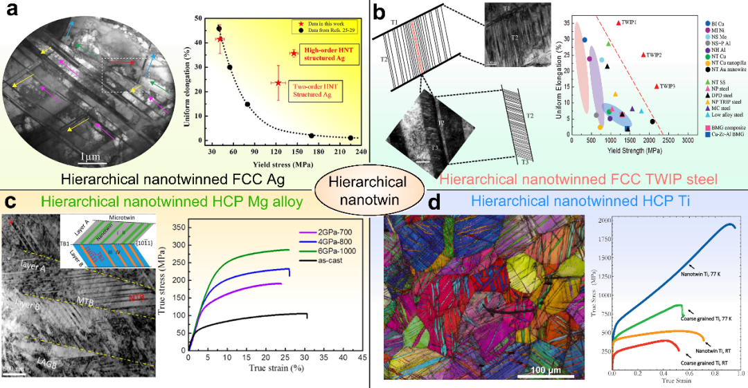 图10 具有良好强塑性匹配的的多级纳米孪晶结构金属材料(a)银;(b)TWIP钢;(c)镁合金;(d)纯钛。