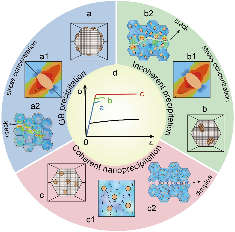 图8 纳米析出相的特性对力学性能的影响 (a) 晶界析出相,(b) 非共格析出相,(c) 晶粒内部的共格纳米析出相。在拉伸载荷下,(a1)晶界析出相和(b1)非共格析出相周围出现应力集中,分别引起 (a2) 晶间脆性断裂和 (b2)析出物和基体之间非共格界面裂纹扩展。而(c1)在共格纳米析出相周围没有形成明显的应力集中,导致(c2)延性断裂模式。(d)引入共格纳米析出相,导致强度-延展性协同优于引入晶界析出相和晶内非共格沉淀物所实现的效果。