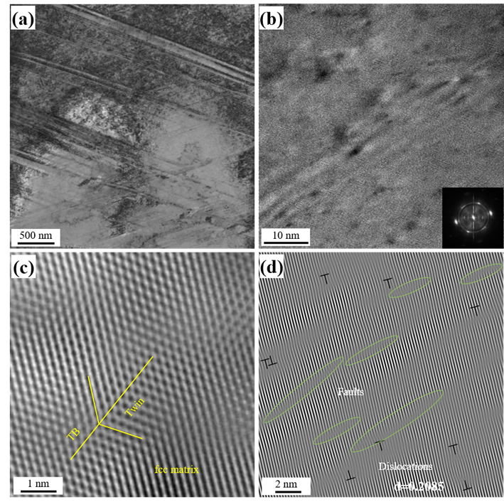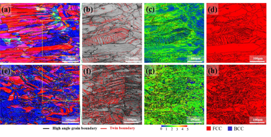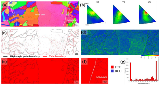 本文研究了CrMnFeCoNi合金与316LN不锈钢异种激光焊接接头的显微组织和力学性能。系统分析了不同变形温度下焊缝中的显微组织演变对力学性能的影响规律及其微观机理。焊接接头的室温和低温抗拉强度均能达到母材强度的90 %以上,为未来高熵合金作为低温结构材料应用于核聚变超导磁体、氢能源以及航空航天领域提供了基础数据和理论支撑。目前,316LN奥氏体不锈钢由于具有优异的综合力学性能被选为国际热核聚变实验堆(ITER)项目中的结构材料。然而,随着核聚变超导磁体磁体系统的不断升级,将需要具有更高强度和韧性的低温结构材料来抵抗施加在铠甲及其超导材料上的强大电磁力。高熵合金(HEA)具有卓越的机械性能(高强高韧),使其成为在低温下使用的潜在候选结构材料,以承受超导磁体服役期间产生的洛伦兹力施加的高应力。另一方面,考虑到加工周期和成本,在大型超导磁体结构设计过程中,高应力区域部件将选择具有较高强度和韧性的结构材料,低应力区域将使用316LN等奥氏体不锈钢材料。因此,有必要在部件的制造过程中开展316LN和高熵合金之间的可靠焊接工艺研究。本工作旨在研究316LN/高熵合金异种焊接接头的微观组织演变及低温力学性能,推动高熵合金材料在大科学装置及氢能源等领域的工程化应用。松山湖材料实验室王维研究员与中科院理化所李来风研究员团队(杨潇副研究员)以及南昌航空大学王善林教授等单位科研人员合作,通过研究CrMnFeCoNi合金与316LN异种激光焊接接头在塑性变形过程中的组织演变发现,室温条件下焊缝的变形组织主要由位错、层错和变形孪晶组成,孪生和位错滑移相互竞争、相互促进,共同实现材料的塑性变形。当变形温度降低至77K时,变形孪晶的体积分数逐渐增大,位错滑移显著受到抑制,变形孪晶的形成主导了塑性变形过程。此外,低温条件下并未发现马氏体转变。获得的优异焊接接头力学性能,将提高高熵合金作为聚变反应堆、氢能源以及航天航天等领域结构材料应用的潜力。相关研究成果以“Dissimilar laser welding of CrMnFeCoNi high entropy alloy and 316LN stainless steel for cryogenic application”为题,发表在《Journal of Materials Science & Technology》上。图1 焊接接头的SEM图:(a)焊接接头宏观形貌,(b)EDS线扫描的元素分布图,(c)316LN侧熔合线附近的EDS图,(d)CrMnFeCoNi侧熔合线附近的EDS图,(e)熔合区中心的ESD图。图2 焊接接头的EBSD图:(a)和(b)反极图(IPF),(c)晶界分布图,(d)KAM图,(e)和(f)相图,(g)晶界取向差图。图3焊接接头中316LN、焊缝区和高熵合金不同区域的XRD图。图4 焊缝区域的TEM图:(a)TEM-BF图,(b)SAED图,显示单相FCC结构,(c)和(d)晶界和晶粒内部的HRTEM图(带FFT图)。图5 焊接接头的拉伸性能:(a)室温和77K的应力-应变曲线,(b)室温下断口SEM图,(c)77K断口SEM图,(d)颗粒的EDS分析。图6 纳米压痕测试:(a)焊接接头的硬度分布图,(b)和(c)两侧熔合线附近的典型载荷-位移曲线。图7 焊接接头断口附近的EBSD图:(a)室温IPF图,(b)室温放大BC图,(c)室温KAM图,(d)室温相图,(e)77 K IPF图,(f)77 K放大BC图,(g)77 K KAM图,(h)77 K相图。图8 室温下断口附近变形组织的TEM图:(a)变形亚结构,(b)图8(a)放大图显示变形亚结构,(c)变形带的HRTEM图(带FFT插图),(d)图8(c)的反傅里叶变换图(IFFT)。图9 77K下断口附近变形组织的TEM图:(a)变形亚结构,(b)图9(a)放大图显示变形亚结构(带FFT插图),(c)和(d)图8(b)的反傅里叶变换图(IFFT)。图10 断口附近TEM样品的TKD图:(a)室温BC图,(b)室温IPF图,(c)室温相图,(d)77K BC图,(e)77K IPF图,(f)77K相图.本文系统研究了CrMnFeCoNi高熵合金与316LN奥氏体不锈钢异种激光焊接接头在室温和低温下的显微组织与力学性能。利用SEM,XRD,EBSD和TEM等技术分析了塑性变形过程中的微观结构演变对力学性能的影响。结果表明,焊接接头的室温和低温抗拉强度均能达到母材强度的90 %以上。在77K低温塑性变形过程中,孪晶主导了变形过程,并未发现马氏体转变。未来实现高熵合金性能的更大提升,以及优化焊接工艺参数,获得优质的焊接接头并对异种接头4.2K条件下的显微组织演变规律和力学性能的相关性开展深入研究,这将有利于推动高熵合金在低温工程中的实际应用。论文地址:Jijun Xin, Wei Wang, Xiao Yang, Mebrouka Boubeche, Shanlin Wang, Hengcheng Zhang, Chuanjun Huang, Yong Li, Bingkun Lyu, Fuzhi Shen, Wentao Sun, Laifeng Li, Dissimilar laser welding of CrMnFeCoNi high entropy alloy and 316LN stainless steel for cryogenic application, J. Mater. Sci. Technol. 163 (2023) 158-167.王维,松山湖材料实验室实用超导研究团队研究员,博士生导师,广东省重大人才工程青年拔尖人才,中国船舶军民融合发展研究中心智库专家,广东省高层次人才评审专家,东莞市特色人才,材料人网2023年度优秀青年科学家。长期致力于实用超导相关低温材料与系统研发。主持了科技部重点研发计划课题、国家自然科学基金面上、粤莞联合基金重点项目、广东省JMRH专项资金等国家、省部级横纵向项目20余项。Microstructures,金属学报期刊青年编委,在Adv. Mater.,J. Mater. Sci. Technol., Scripta Mater. 和Mater. Des.等学术期刊上发表论文56篇,受理/授权专利14项。杨潇,中科院理化所副研究员。近年来,主持纵向国家、地方纵向科研项目/课题和科学院科研项目7项,横向技术开发项目4项。获省部级学术奖励2次。参编并出版高熵合金材料方向科研专著1部。主要从事高熵材料的设计、研发及产业化应用研究,已在Journa