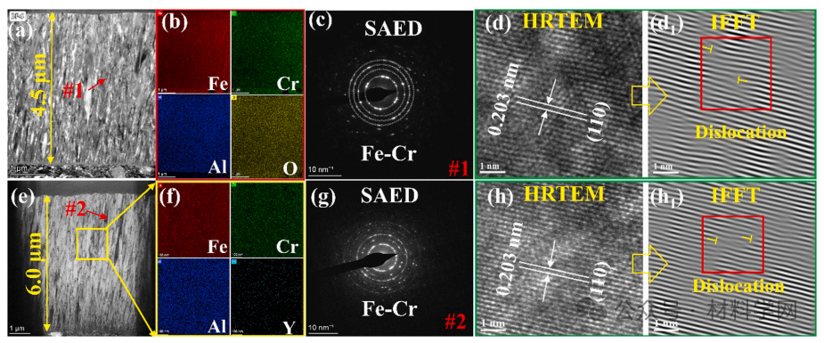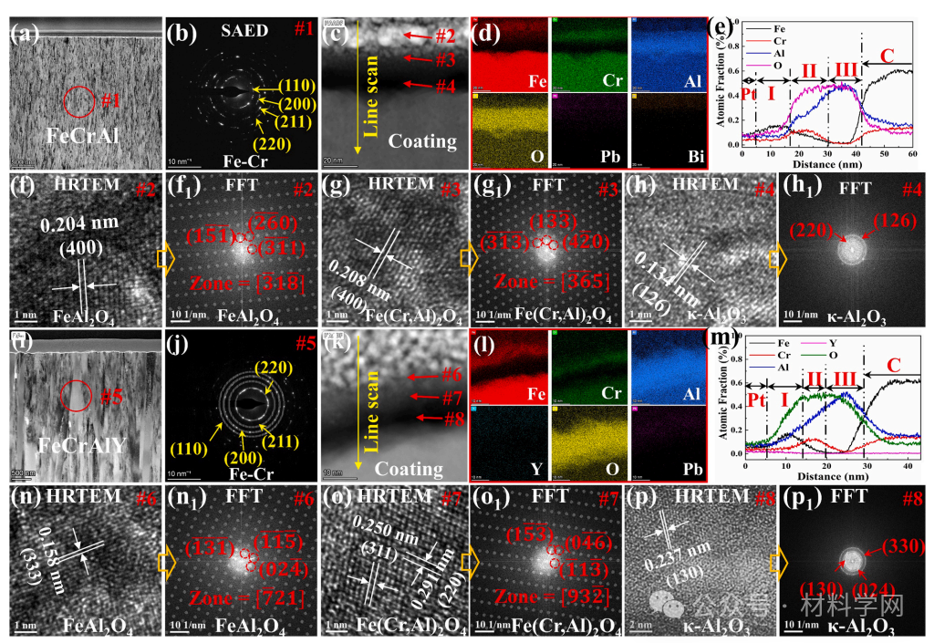 图 4 未辐照-腐蚀区域FeCrAl和FeCrAlY涂层表面腐蚀层结构分析。(a)和(i)未辐照-腐蚀区域FeCrAl和FeCrAlY涂层截面形貌;(b)和(j)未辐照-腐蚀区域FeCrAl和FeCrAlY涂层晶体结构;(c)-(e)和(k)-(m)未辐照-腐蚀区域FeCrAl和FeCrAlY涂层表面腐蚀层元素分布;(f)-(h1)和(n)-(p1)未辐照-腐蚀区域FeCrAl和FeCrAlY涂层表面腐蚀层结构分析。