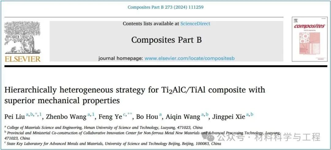 相关研究成果以题为“Hierarchically heterogeneous strategy for Ti2AlC/TiAl composite with superior mechanical properties”发表在复合材料领域顶级期刊《Composites Part B:Engineering》(影响因子:13.1)。河南科技大学柳培副教授为第一作者和通讯作者,硕士研究生王振博为共同第一作者,北京科技大学叶丰教授为共同通讯作者。该研究得到了国家自然科学基金和新金属材料国家重点实验室开放基金的支持。