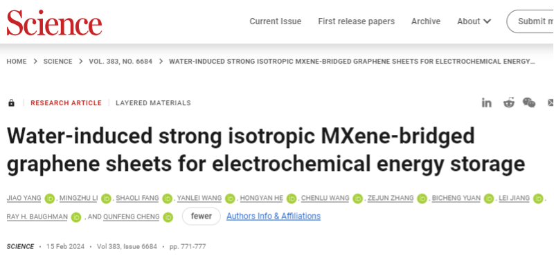 北航新闻网2月16日电(航宣)2024年2月16日,《Science》杂志报道了北京航空航天大学化学学院程群峰教授团队在纳米复合材料研究上取得的最新进展:《Water-induced strong isotropic MXene-bridged graphene sheets for electrochemical energy storage》,该工作首次利用纳米限域水在室温常压下制备了具有超高拉伸强度(1.87GPa)的面内各向同性Ti3C2Tx交联石墨烯复合薄膜,为其他二维材料的有序组装提供了一种新的策略【Science2024, 383,771】。
