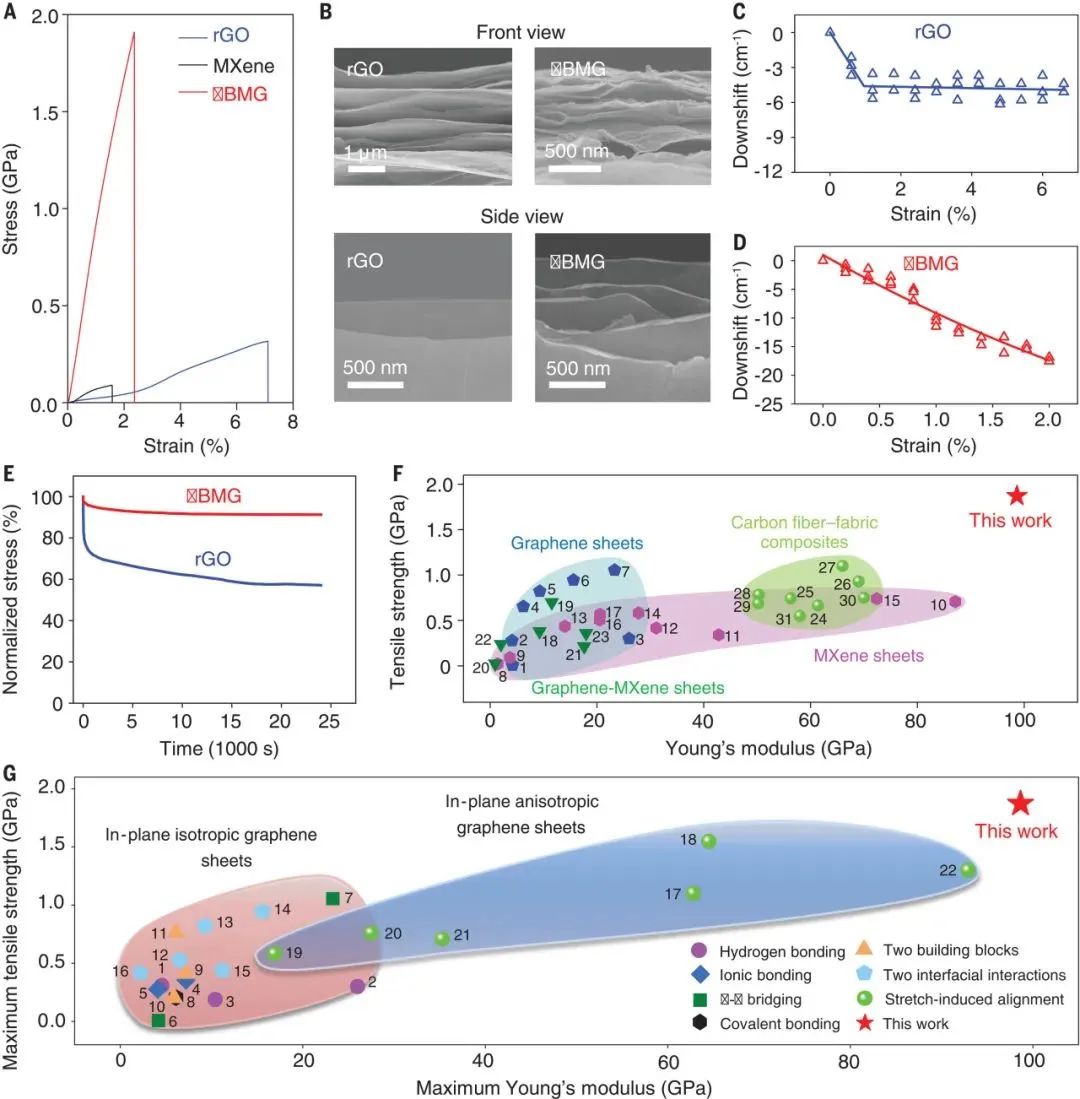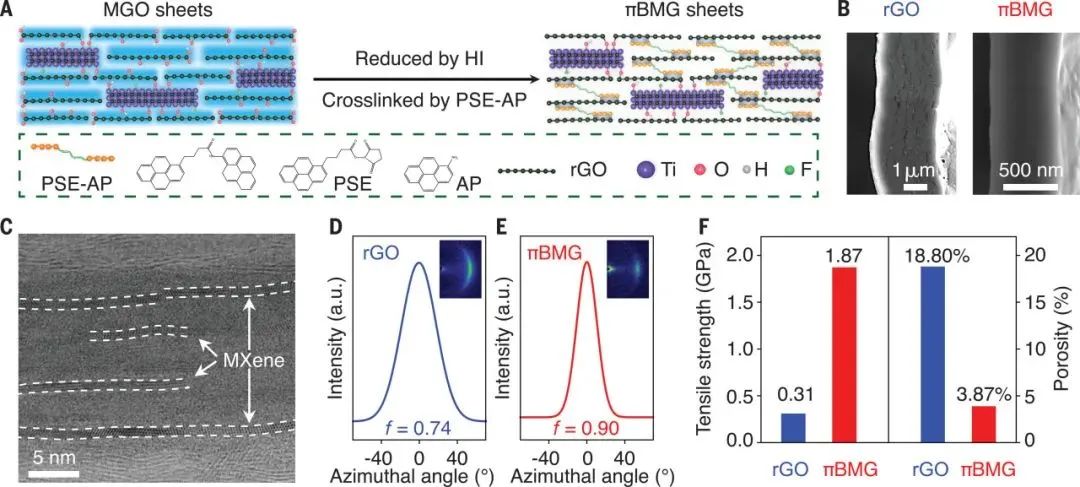 在室温常压下制备具有面内各向同性的高性能纳米复合材料一直是该领域的研究难点。研究者们对高度取向的MGO薄膜进行还原和π-π交联,不仅提升了薄膜的取向度,同时有效降低了薄膜内部的孔隙率,制备出了具有超高力学性能的面内各向同性π-π交联Ti3C2Tx石墨烯(πBMG)薄膜。其拉伸强度高达1.87GPa, 杨氏模量高达98.7GPa,高于目前文献报道室温下制备的其他石墨烯薄膜,该策略有效降低了高性能纳米复合材料的制造能耗,实现了绿色低碳制造。