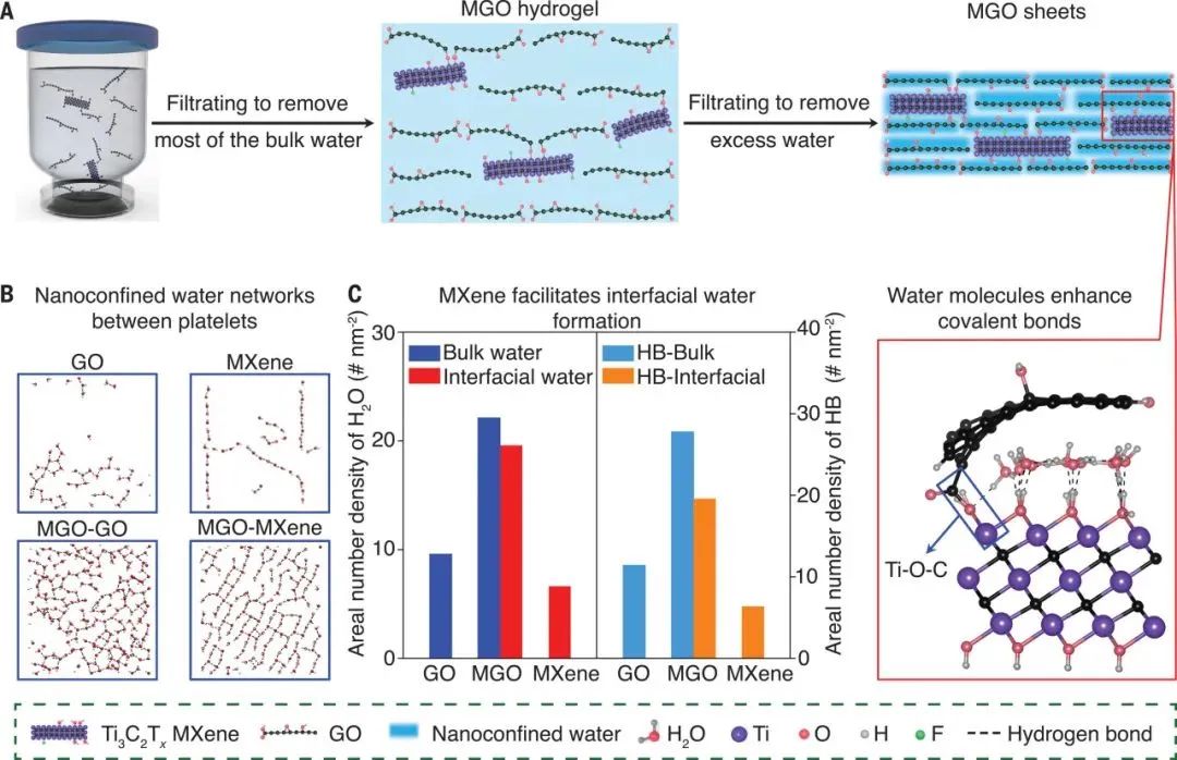 在二维纳米复合材料的湿化学法组装过程中,由于毛细收缩的存在,导致纳米复合材料高密实度和高取向度难以兼得,研究团队以具有相似尺寸的氧化石墨烯(GO)和Ti3C2Tx纳米片为原料,在室温下通过持续真空抽滤的方法将水分子限制在纳米片层间,形成室温下稳定的纳米限域水,有效降低了纳米片的毛细收缩,制备出了高度取向的面内各向同性Ti3C2Tx交联GO(MGO)前驱体薄膜,同时实现了MGO膜的高密实度和高取向度。