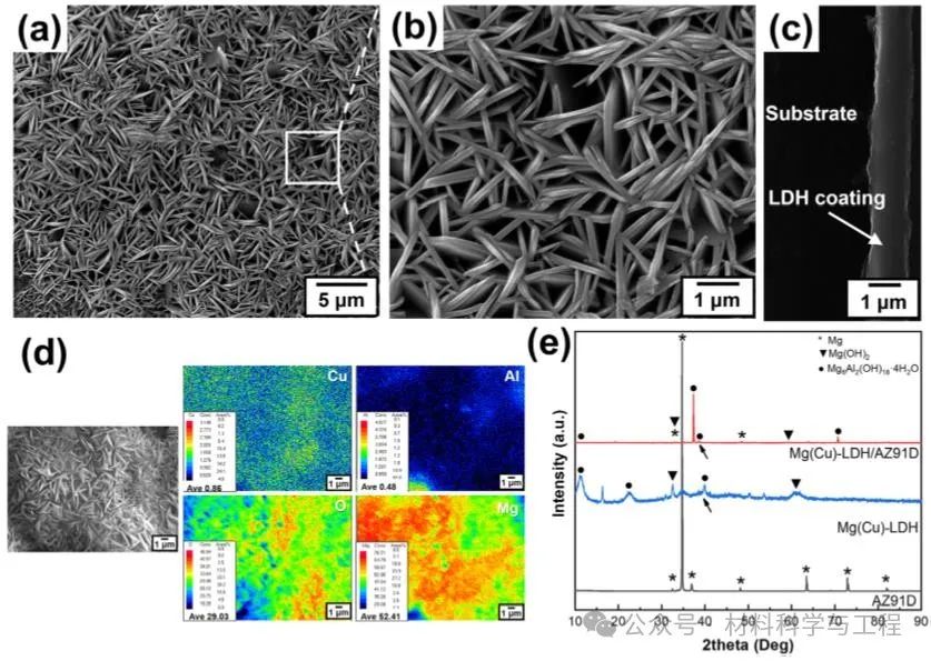 图2 (a-b)Mg(Cu)-LDH/AZ91D的SEM形貌图;(c)截面SEM图和(d)Mg(Cu)-LDH/AZ91的EPMA图;(e)AZ91D和Mg(Cu)-LDH/AZ91D的XRD图