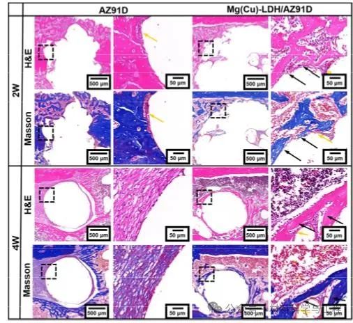 近日,中南大学等单位的研究者设计了一种具有LDH结构的镁合金涂层,通过共沉淀和水热处理两步法在镁合金表面构建含铜离子的MgAl-LDH,大幅提高耐蚀、抗菌和促成骨的效果。其中短期和长期耐蚀性的提高归因于LDH屏障的作用。镁离子和铜离子双重离子协同抗菌对大肠杆菌和金黄色葡萄球菌有良好的抑制作用。在植入大鼠股骨2周和4周后,组织染色切片表明该材料无毒性且具有良好的成骨作用。相关论文以题为“Enhanced corrosion resistance, antibacterial properties and osteogenesis by Cu ion optimized MgAl-layered double hydroxide on Mg alloy”发表在镁合金顶刊《Journal of Magnesium and Alloys》上。中南大学王清鸽博士为论文第一作者,中南大学吴宏教授和中南大学湘雅二医院刘波副主任医师为论文共同通讯作者。