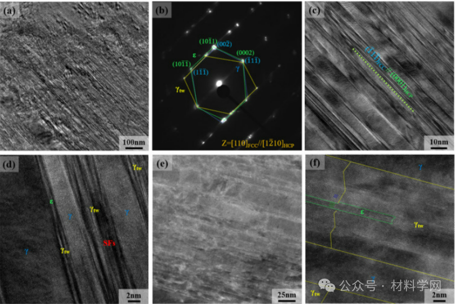77 K温度下的变形机制:(a) HRTEM图像显示孪晶和位错壁,(b)相应的SAED,表明高密度的纳米孪晶和FCC→HCP马氏体相变的形成,(c) FCC-HCP片层双相结构的亮场TEM图像,(d)变形孪晶(γtw),层错(sf)和马氏体相变(ε)的放大图像,(e, f)变形晶粒的高分辨率HAADF-STEM图像。