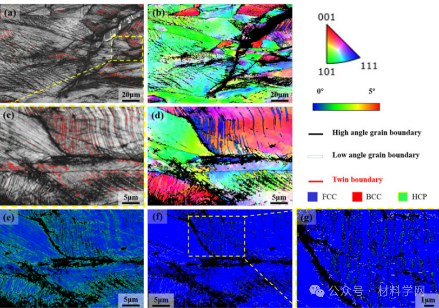 图3(e)中4.2 K时白色矩形内的EBSD放大图像:(a) BC图像,(b) IPF图像,(c)图5中放大的BC图像(a), (d)图5中放大的IPF图像(a), (e)图5中放大的KAM图像(a), (f)图5中放大的相位图(a), (g)图5(f)中放大区域的详细相位图,表明部分FCC→HCP马氏体相变。