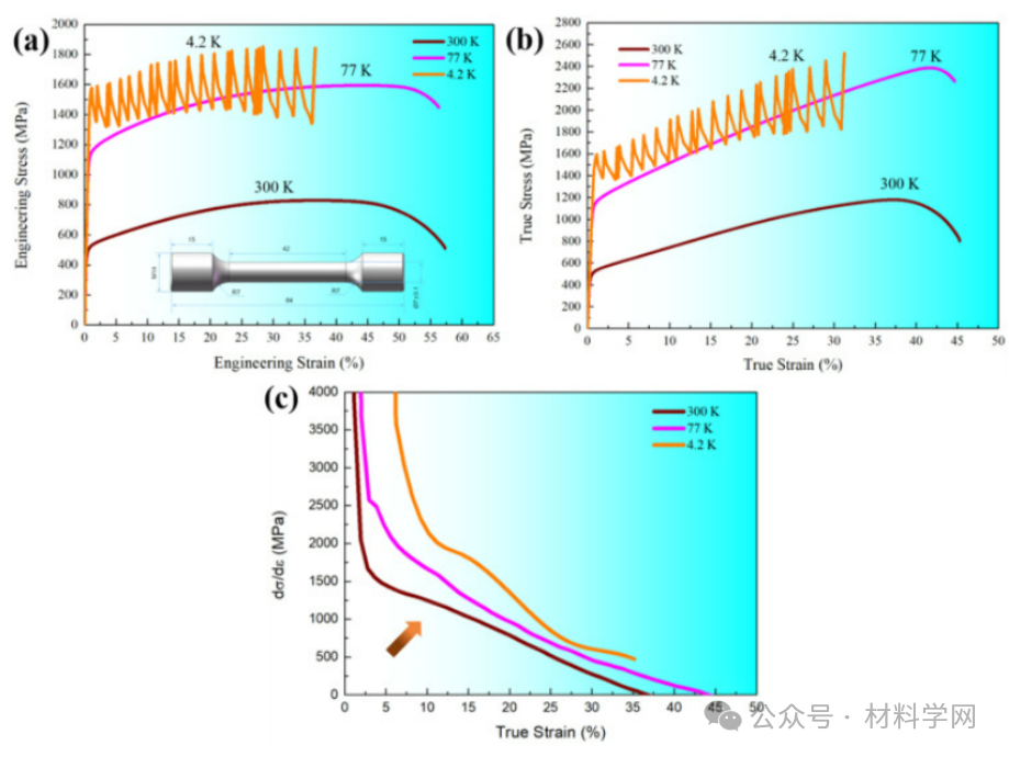 合金的拉伸性能:(a)在4.2 ~ 300 K下具有代表性的拉伸应力-应变曲线,(b)在4.2 ~ 300 K下对应的真应力-应变曲线,(c)应变硬化曲线,随着测试温度的降低,应变硬化率显著增加。