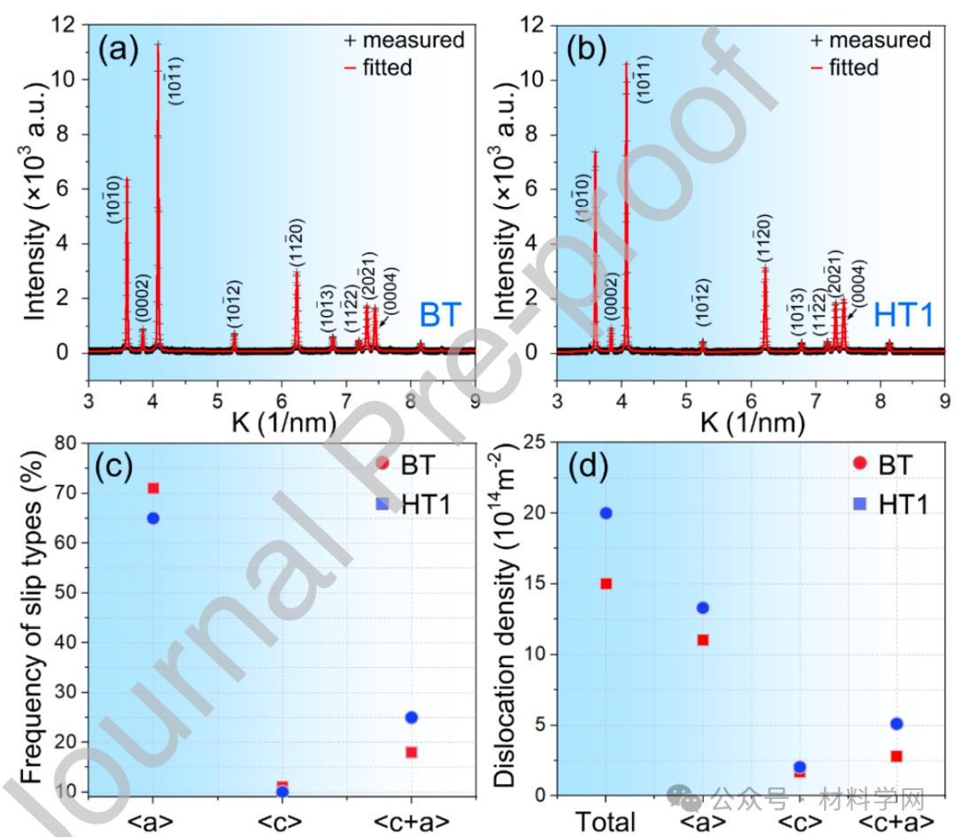 图5. BT (a) 和HT1 (b) 样品在10%拉伸应变后的同步加速器x射线衍射测量和拟合数据以及拟合数据与测量数据之间的强度差异。(c) 10%拉伸应变后 BT 和 HT1 样品的 、和型位错频率,(d) 总位错密度、、和型位错密度