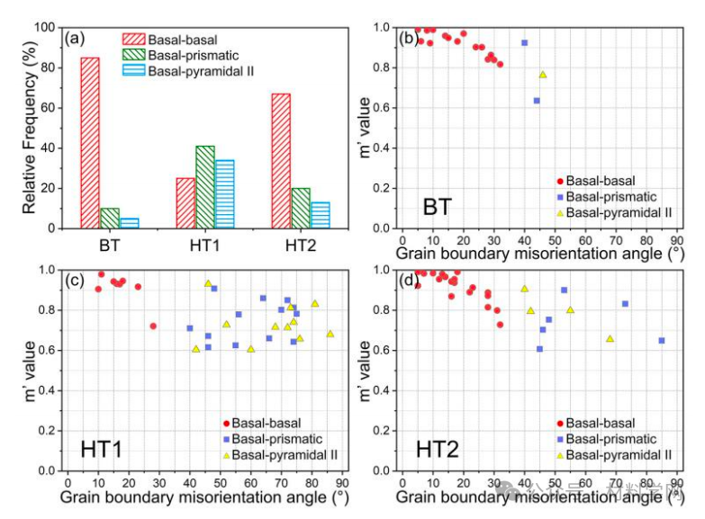 图 10. (a) BT、HT1 和 HT2 样品中不同转移滑移模式的频率。(b-d) BT、HT1 和 HT2 样品的 m' 系数与 BT、HT1 和 HT2 样品晶界取向偏差的关系