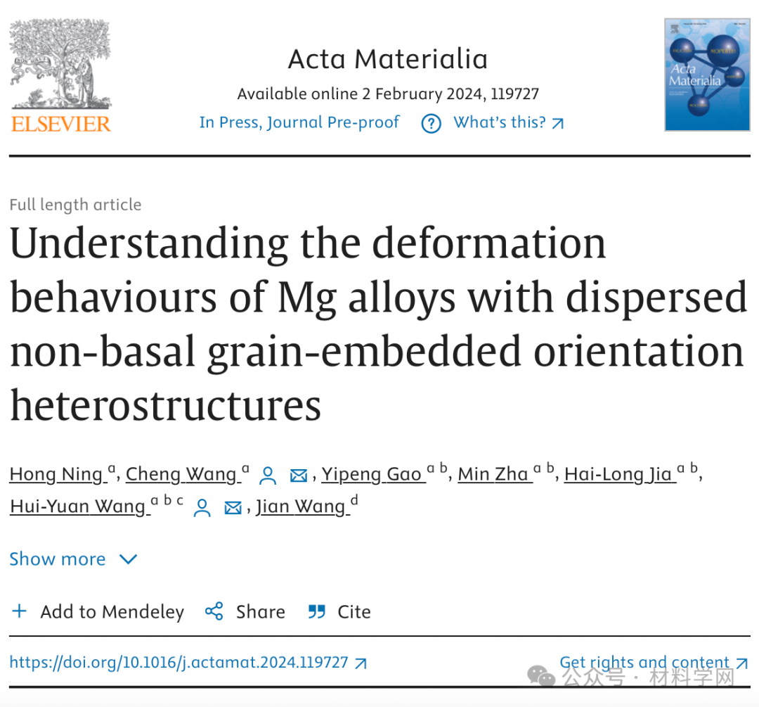 相关研究成果以“Understanding the deformation behaviours of Mg alloys with dispersed non-basal grain-embedded orientation heterostructures”发表在Acta Materialia上。