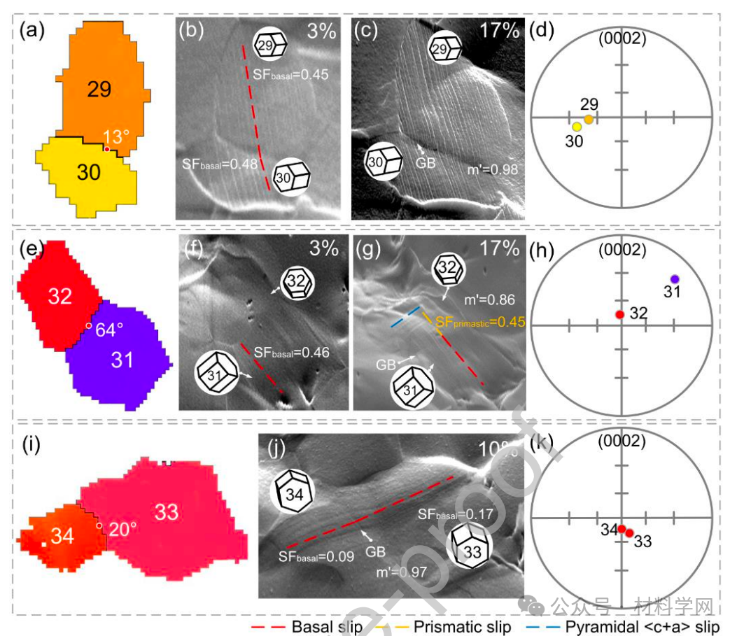 图 9. (a, e, i) IPF 图、(b, c, f, g, j) SEM 图和 (d, h, k) (0002) 极点图显示了三对晶粒的滑移转移行为:(a-d) 软晶粒 29 和软晶粒 30,选自 HT2。(a-d)软晶粒 29 和软晶粒 30(选自 HT2 软晶粒 29 和软晶粒 30 显示基底-基底型滑移;(e-h)软晶粒 31 和硬晶粒 32 选自 HT1 软晶粒 31 和硬晶粒 32 显示基底-棱镜型滑移;(i-k) 选自 BT 样品的硬晶粒 33 和硬晶粒 34 显示基底-基底型滑移。BT 样品中的硬晶粒 33 和硬晶粒 34 显示基底-基底型滑移