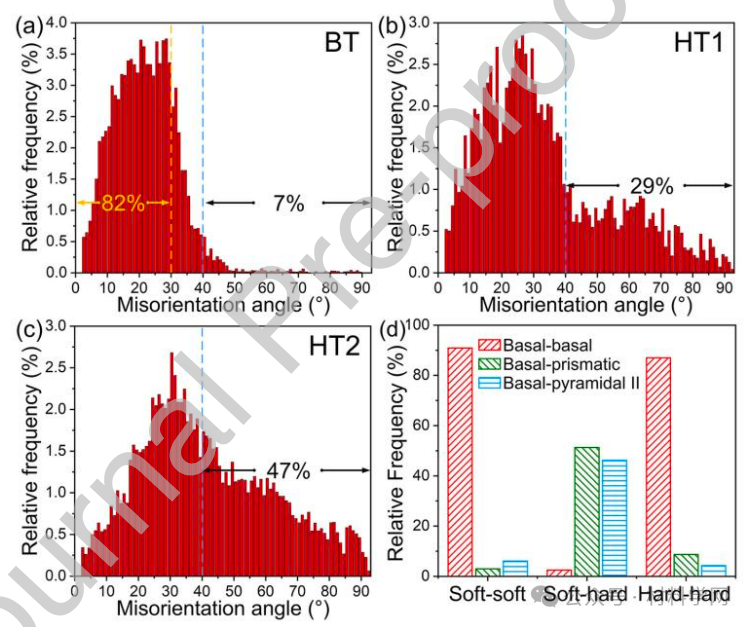图 11. (a) BT、(b) HT1 和 (c) HT2 样品的晶界错向分布。(d) 在软-软、软-硬和硬-硬晶粒对中不同滑移传递模式的频率