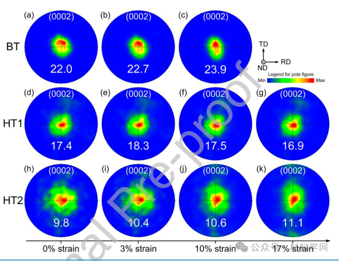 图 4. BT、HT1 和 HT2 样品在单轴拉伸过程中沿 RD 的准原位(0002)纹理演变 (a, d, h) 初始;(b, e, i) ~3% 应变;(c, f, j) ~10% 应变;(g) 和 (k) ~17% 应变