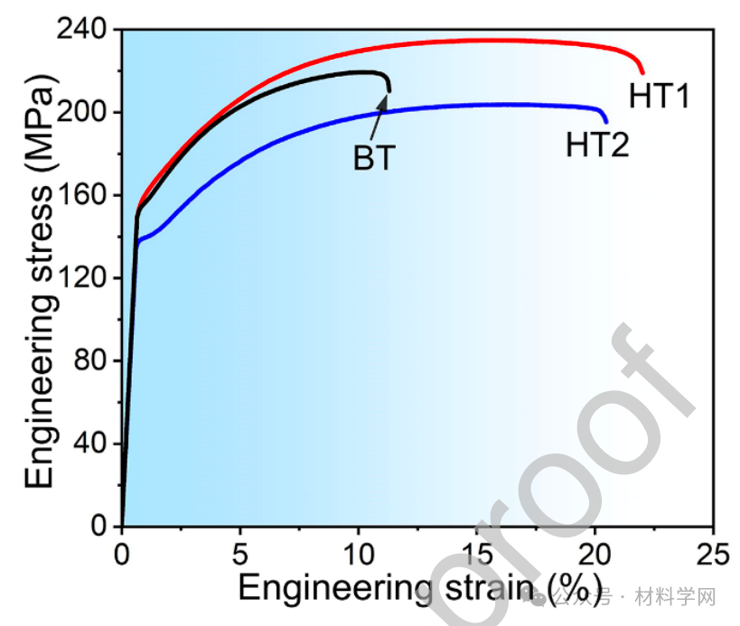 图 2. 室温下沿 RD 测试的 BT、HT1 和 HT2 样品的典型拉伸工程应力-应变曲线。室温下沿 RD 测试的 BT、HT1 和 HT2 样品的典型拉伸工程应力-应变曲线