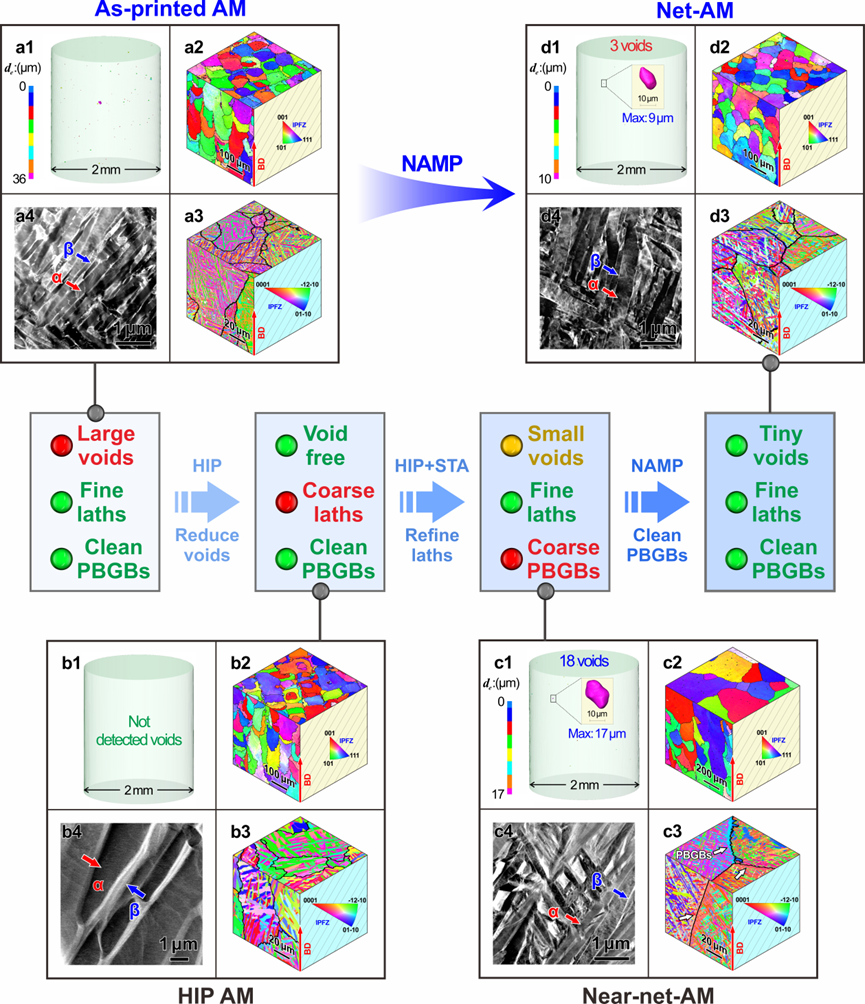 北京时间2024年2月29日,中国科学院金属研究所张哲峰研究员、张振军研究员、杨锐研究员与美国加州大学伯克利分校Robert O. Ritchie教授合作在Nature期刊上发表了一篇题为“High fatigue resistance in a titanium alloy via near void-free 3D printing”(近无微孔3D打印钛合金高抗疲劳性能)的研究成果。 该成果通过发明缺陷与组织分步调控的NAMP新工艺(Net-Additive Manufacturing Process),制备出几乎无气孔的近Net-AM组织Ti-6Al-4V合金,有效避免了从打印气孔、粗大板条及α相富集晶界等多种疲劳短板处开裂,展示出3D打印组织自身特有的高疲劳抗性:其拉-拉疲劳强度高达978 MPa,在目前已报道的所有材料疲劳数据中具有最高的比疲劳强度。 论文第一作者为曲展,论文通讯作者为张振军、Robert O. Ritchie、张哲峰。 3D打印,又名增材制造(Additive manufacturing,AM),因其得天独厚的自由成形能力极大地满足了高端装备和构件对高集成性、多功能性、轻量化、一体化的需求,被认为是制造领域的颠覆性技术。因而,3D打印材料在航空航天等领域得到极大关注和初步应用。然而,与传统制造技术相比,3D打印制备的材料在循环载荷下的疲劳性能普遍较差,严重制约了其作为结构承力件的广泛应用。因此,如何提升3D打印材料与构件的疲劳性能是国内外学术界与工程界热切关注的焦点问题。 这项工作中,张哲峰团队首次明确提出:理想状态下3D打印技术直接制备出的钛合金组织本身(称为Net-AM组织)应具有天然的超高疲劳性能,而打印过程中产生气孔等缺陷作为疲劳短板掩盖了其自身组织抗疲劳的优点,导致实际测量的3D打印材料疲劳性能往往大幅降低。因此,提升3D打印材料疲劳性能的关键在于消除打印气孔的同时,尽可能保留原始打印的组织状态。然而,目前消除气孔的工艺往往伴随组织粗化,而细化组织处理又会带来气孔复现,甚至引发易于疲劳开裂的晶界α相富集等新的不利因素,可谓进退两难。幸运的是,张哲峰团队在Ti-6Al-4V合金中首次发现:3D打印态组织在高温下相转变、晶界迁移与气孔长大过程具有异步特性;这意味着存在一个宝贵的热处理工艺窗口,既可实现板条组织细化,又能有效抑制晶界α相富集及气孔复现。为此,他们巧妙地利用了这一工艺窗口期,发明了缺陷与组织分步调控的NAMP新工艺(Net-Additive Manufacturing Process)(图1),最终制备出几乎无气孔的近Net-AM组织钛合金。