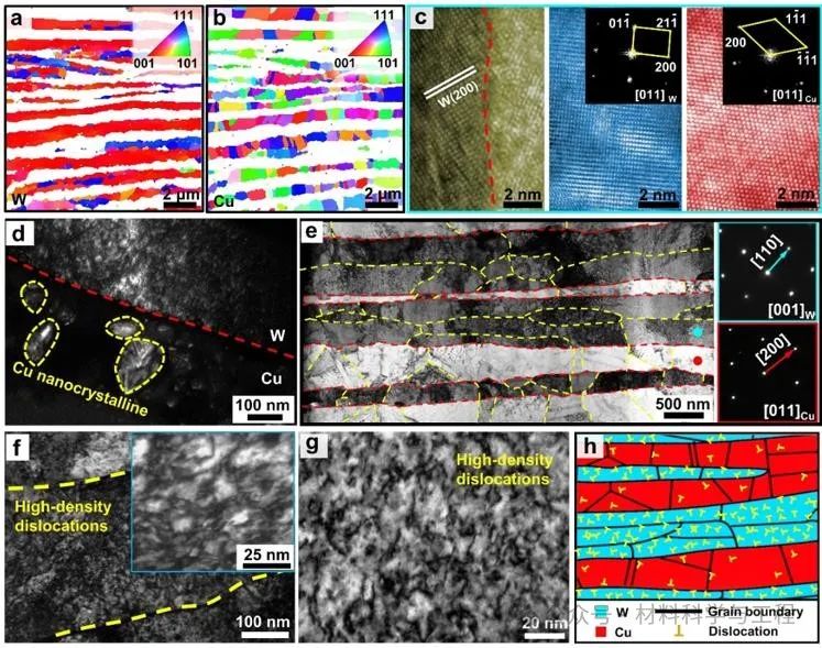 图4 SAL W-Cu复合材料及镀铜钨片的内部微观结构:a-b,复合材料中钨相和铜相朝向VD方向的晶粒取向分布;c,界面结构;d,镀铜钨片中的铜纳米晶;e,复合材料内部的微结构;f,预制钨片内部的高密度位错;g,复合材料中钨相内部的高密度位错;h,SAL W-Cu复合材料内部微观结构示意图。