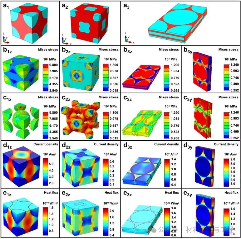 图1具有不同构型特征的钨铜复合材料的力学和物性的有限元模拟:a,钨颗粒增强的钨铜(a1)、钨骨架增强的钨铜(a2)和本研究的SAL W-Cu (a3)的三维周期性有限元模型;b-e,各种构型特征的复合材料中的应力分布(b)、钨相的应力分布(c)、电流密度分布(d)和热流密度分布(e)。