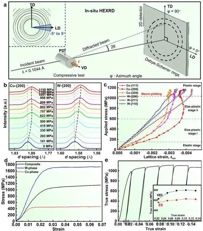 图6 a,同步辐射研究原位压缩过程的示意图;b,原位压缩过程中{200}Cu和{200}W的晶面间距随应力的变化;c,原位压缩过程中钨相和铜相不同晶面的晶格应变随应力的变化;d,基于同步辐射结果计算的原位压缩过程中钨相和铜相实际承受的载荷;e,SAL W-Cu复合材料的加载卸载循环曲线。