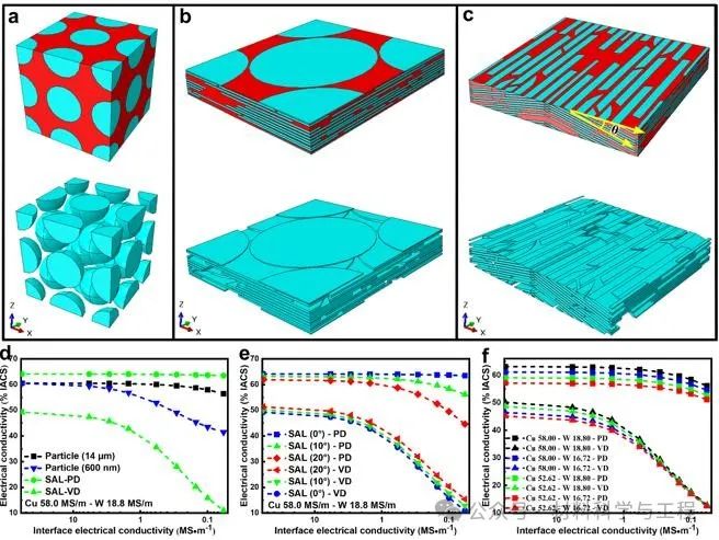 图9考虑钨相和铜相中的缺陷(孔隙、内界面、位错等)、钨层的弯曲角和界面阻抗对SAL W-Cu电导率影响的有限元模型及计算结果。