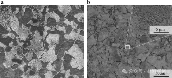 工程材料中一个微小的结构缺陷都可能带来相当大的局部应力集中,从而可能导致灾难性的破坏,造成重大的生命和财产损失。因此,有效缓解局部应力集中是材料设计中的一项重要任务。在金属材料的成分设计和冶金生产过程中,经常会形成与基体弹性模量有显著差异的夹杂物或次生相。当外部应力导致位错移动时,位错往往会聚集在高能位置,形成一些微孔(裂纹源)。微孔处存在三向应力集中,通常会在应力作用下扩展并合并成凹陷或微裂纹。Wang 和 Zhang发现微裂纹的尖端容易引起局部应力集中,裂纹沿晶界或在晶粒内逐渐扩展。由于缺陷能量较高,晶界更容易被撕裂,从而形成断裂面。为了延缓晶界和晶粒内部的失效,Yan 等人采用循环应变模式在镁合金中设计了合理数量的晶界和孪晶界。虽然这在一定程度上平衡了材料的强度和塑性,但抑制应力集中和裂纹扩展的效果并不显著。Huang 等人提出了位错工程理论,通过在高强度马氏体中积累超高密度的位错,可以缓解应力集中并改善材料塑性。马氏体中积累超高密度的位错,从而缓解应力集中并改善材料塑性。然而,这种方法对材料的强度和位错的最大容量要求过高,而且需要突然激活位错。我们在以往的研究中发现了一个有趣的现象,即当存在多个次生相时,相邻应力场会带来相互促进的耦合强化,而强化效果与次生相的分布和形态有关。目前,关于如何充分利用第二相的强化效应来缓解金属材料应力集中的研究仍处于早期阶段。 近年来,仿生工程 已成为材料设计中一种前景广阔的方法。在材料设计中大有可为。Wu 等人从螳螂虾的身体结构中汲取灵感,设计出一种仿生微结构,显著提高了材料的吸能性能。同样,Shi 等人开发了一种仿生鱼骨状微结构,以限制裂纹扩展路径。目前已开发出多种仿生结构,如仿蜂窝结构、仿软体动物结构、仿投手植物结构、仿鲨鱼盾鳞结构等。然而,这些仿生项目仍处于早期阶段,需要进一步开发才能实现产业化。关键是要开发出与冶金钢铁工业现有设备兼容的新型仿生金属材料加工技术。竹纤维的天然结构由纤维素、半纤维素和木质素组成,表现出复合、多相和异质结构的特点。纤维束由不同长度的实质细胞形成。纤维壁呈现异质微观结构,从外层到内层的厚度各不相同。竹子的这种纤维异质结构有助于提高其强度和韧性。受天然竹子结构的启发,我们开发了一种具有模仿竹纤维的异质结构的中碳钢,利用多种强化机制。利用异质边界和胶结物的耦合构建点线拓扑结构,有效传递应力并缓解应力集中,从而在保持优异塑性的同时显著提高屈服强度。有关此课题,华北理工大学联合悉尼大学廖晓舟教授进行了深入研究,相关研究成果以“Strong yet ductile bionic steel by mitigating local stress concentration function”发表在“Journal of Materials Science & Technology”上 https://www.sciencedirect.com/science/article/pii/S1005030224001774?via%3Dihub图 1. 初始普通碳钢(a)和预处理后(b)的微观结构。图 2. 热轧和退火后假共晶样品的微观结构和机械性能 轧制和退火后的微观结构和力学性能。(a)天然竹纤维结构图。(b-d)分别是在 550、600 和 650 °C 下轧制的样品。其中 F 代表铁素体,PF 代表原共晶铁素体,EF 代表共晶铁素体、 θ 代表胶合铁素体曲线,(f)屈服强度-均匀伸长率比较。轧制方向称为 RD,与轧制工具接触表面的法线方向称为 ND,而 TD 表示与其余两个方向垂直的方向。 图 3. 仿生钢在轧制和退火过程中的铁素体晶粒尺寸信息(a-c)和取向差演变(d-f)。图 4. 竹纤维复合材料中碳素结构钢的精细表征和结构参数统计。(a) TEM 发现样品的微观结构中存在大量位错,且雪明碳酸盐已明显球化。(b) TEM 观察结果表明,大尺寸的雪明碳酸盐很容易聚集在晶界处,从而对晶界产生针刺效应。对晶界产生了钉扎作用。(c、d)通过 TEM 观察到,铁素体晶粒内部析出了纳米级的雪明碳酸盐。在 A-600 样品的铁素体晶粒内部析出,而其他位置上的雪明碳酸盐尺寸较大(c),形成了多尺度的雪明碳酸盐分布特征,而且雪明碳酸盐的分布更为分散(d)。(e) 用金属材料线性强化理论分别量化了奥罗旺强化机制(σC)、晶界强化机制(σGB)、位错强化机制(σdis)和 HDI 强化机制(σHDI)对屈服强度(YS)的贡献。(f) 利用 TEM、Image Pro 和 EBSD 计算雪明碳酸盐的面积分数和平均直径,发现雪明碳酸盐的分布 (