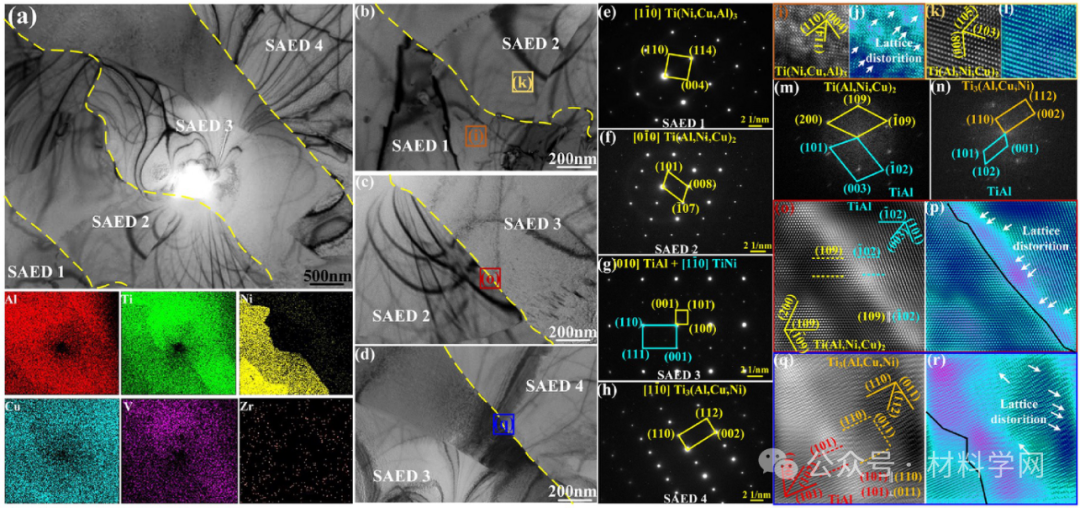 图9. 在1100°C/10分钟下采用(Ti21.25Zr25Ni25Cu18.75/Zr25V6.25Cu50Ni18.75)梯度复合非晶填充金属钎焊的接头的透射电子显微镜(TEM)分析结果:(a) 跨越区域II和区域III界面的亮场图像;(b–d) 放大的亮场图像,对应于(a)中标记的区域;(e–h) 对应于(a–d)中标记位置的选择性区域电子衍射图案;(i) 和 (j) (b)中橙色区域的逆快速傅里叶变换(IFFT)图像和晶格间隙重构图像;(k) 和 (l) (b)中白黄色区域的逆快速傅里叶变换(IFFT)图像和晶格间隙重构图像;(m) (c)中红色区域的快速傅里叶变换(FFT)图像;(n) (d)中蓝色区域的快速傅里叶变换(FFT)图像;(o) 和 (p) (c)中红色区域的逆快速傅里叶变换(IFFT)图像和晶格间隙重构图像;(q) 和 (r) (d)中蓝色区域的逆快速傅里叶变换(IFFT)图像和晶格间隙重构图像。(关于本图图例中颜色的解释,请参阅本文的网络版本。)