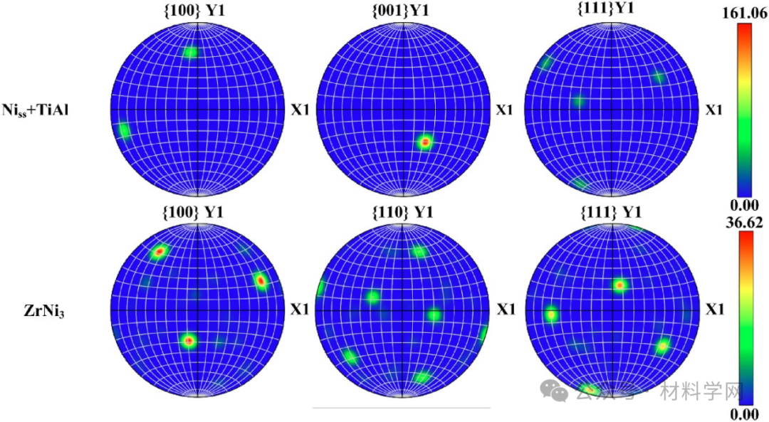 (3) GAFM中的V元素导致了Zone II中无明显优选取向的晶粒转变为呈网状覆盖特征的晶粒,其中,网状覆盖的ZrNi3晶粒具有<223>优选取向,而网状覆盖的Niss + TiAl晶粒具有<131>优选取向。与此同时,该区域晶粒的最大尺寸从62.7 μm减小至52 μm,KAM值更加均匀分布,网状覆盖的ZrNi3晶粒中位错密度更高,有助于将次结构化晶粒的比例从46.6%增加至56.4%。