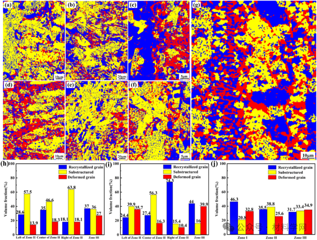 图15. 在1040°C和1100°C下采用(Ti21.25Zr25Ni25Cu18.75/Zr31.25-XVXCu50Ni18.75)钎焊的K4169/(Ti21.25Zr25Ni25Cu18.75/Zr31.25-XVXCu50Ni18.75)/TiAl接头的再结晶晶粒、亚结构和变形晶粒分布情况:(a–c) 和 (h) 在1100°C/10分钟下采用(Ti21.25Zr25Ni25Cu18.75/Zr31.25Cu50Ni18.75) GAFM钎焊的接头;(d–f) 和 (i) 在1100°C/10分钟下采用(Ti21.25Zr25Ni25Cu18.75/Zr25V6.25Cu50Ni18.75) GAFM钎焊的接头;(g) 和 (j) 在1040°C/10分钟下采用(Ti21.25Zr25Ni25Cu18.75/ Zr25V6.25Cu50Ni18.75) GAFM钎焊的接头。