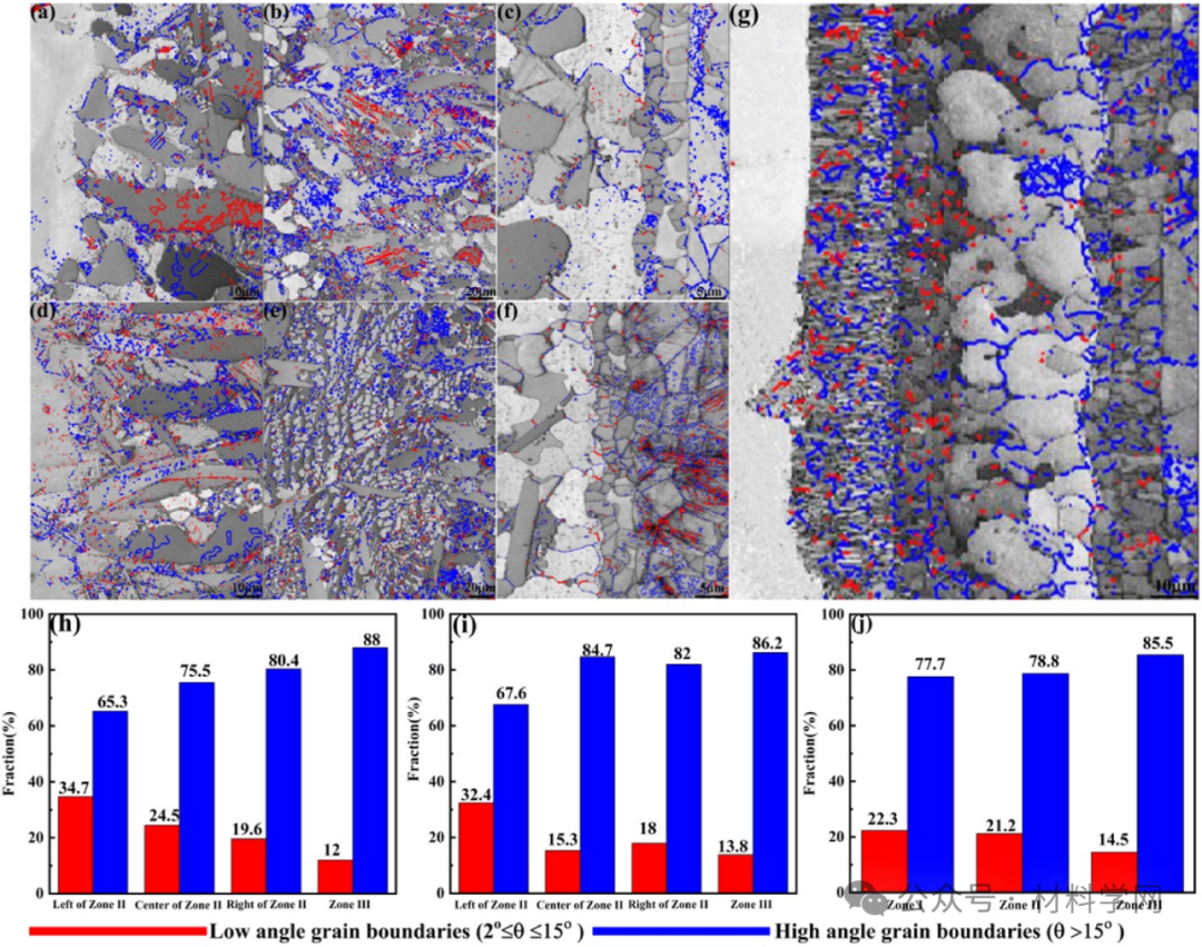图13. 对于1040°C和1100°C下采用GAFMs (Ti21.25Zr25Ni25Cu18.75/Zr31.25Cu50Ni18.75) 和 (Ti21.25Zr25Ni25Cu18.75/Zr25V6.25Cu50Ni18.75) 钎焊的K4169/TiAl接头的HAGBs和LAGBs分布情况进行了研究:(a–c) 和 (h) 在1100°C/10分钟下采用(Ti21.25Zr25Ni25Cu18.75/Zr31.25Cu50Ni18.75) GAFM钎焊的接头;(d–f) 和 (i) 在1100°C/10分钟下采用(Ti21.25Zr25Ni25Cu18.75/Zr25V6.25Cu50Ni18.75) GAFM钎焊的接头;(g) 和 (j) 在1040°C/10分钟下采用(Ti21.25Zr25Ni25Cu18.75/ Zr25V6.25Cu50Ni18.75) GAFM钎焊的接头。