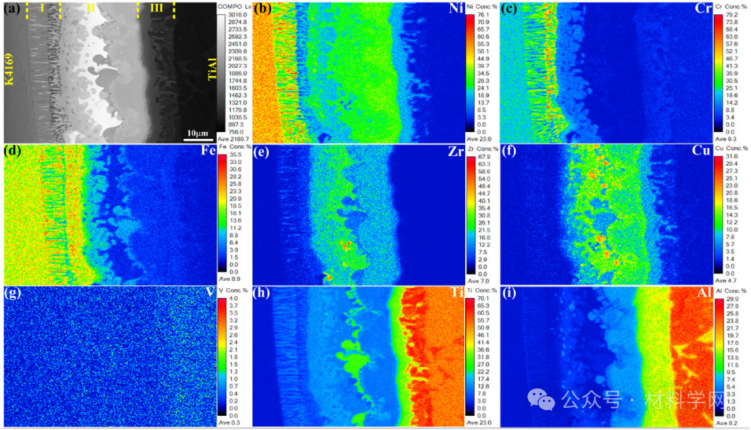 (1)K4169/(Ti21.25Zr25Ni25Cu18.75/Zr31.25-XVXCu50Ni18.75)/TiAl接头的显微结构呈多层结构,主要由固-液扩散反应区(Zone I和Zone III)和填充金属反应区(Zone II)组成。随着钎焊温度的升高,由于界面滞后反应,Zone I溶解为Zone II。Niss + TiAl/(Cr,Fe,Ni)ss/(Ni,Cr,Fe)/ZrNi3/Ti(Ni,Cu,Al)3构成Zone II。Zone III主要由TiAl + TiNi/Ti3Al组成。在GAFM中添加V可以诱导Zone II的晶粒细化,而Zone III转变为Ti(Al,Ni,Cu)2/TiAl+TiNi/Ti3(Al,Cu,Ni)。