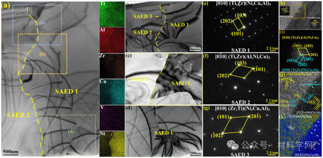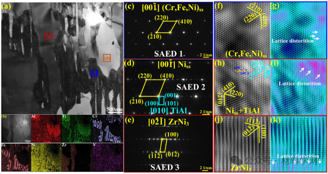 图8. 在1100°C/10分钟下采用(Ti21.25Zr25Ni25Cu18.75/Zr25V6.25Cu50Ni18.75)梯度复合非晶填充金属钎焊的接头的透射电子显微镜(TEM)分析结果:(a) 区域II的暗场TEM图像;(b) (a)中的亮场TEM图像和元素分布;(c)、(d)和(e) 对应于(a)中标记位置的选择性区域电子衍射图案;(f) 和 (g) (a)中蓝色区域的逆快速傅里叶变换(IFFT)图像和晶格间隙重构图像;(h) 和 (i) (a)中橙色区域的逆快速傅里叶变换(IFFT)图像和晶格间隙重构图像;(j) 和 (k) (a)中红色区域的逆快速傅里叶变换(IFFT)图像和晶格间隙重构图像。(关于本图图例中颜色的解释,请参阅本文的网络版本。)