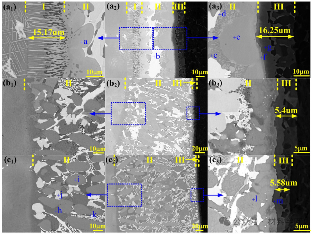 图2. 在不同钎焊温度(保温10分钟)下的K4169/(Ti21.25Zr25Ni25Cu18.75/Zr31.25Cu50Ni18.75)/TiAl钎焊接头的界面微观结构:(a1)–(a3) 1040°C;(b1)–(b3) 1070°C;(c1)–(c3) 1100°C。