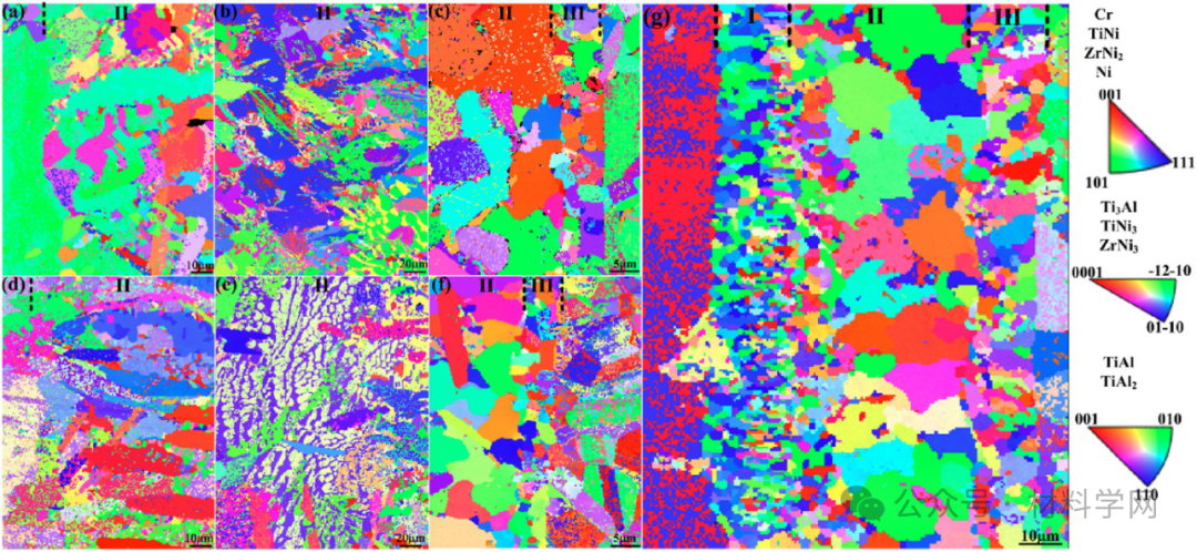 图10. 在1040°C和1100°C下采用(Ti21.25Zr25Ni25Cu18.75/Zr31.25Cu50Ni18.75)和(Ti21.25Zr25Ni25Cu18.75/Zr25V6.25Cu50Ni18.75)梯度复合非晶填充金属钎焊的K4169/TiAl接头的反极图结果:(a–c) 在1100°C/10分钟下采用(Ti21.25Zr25Ni25Cu18.75/Zr31.25Cu50Ni18.75)梯度复合非晶填充金属钎焊的接头;(d–f) 在1100°C/10分钟下采用(Ti21.25Zr25Ni25Cu18.75/Zr25V6.25Cu50Ni18.75)梯度复合非晶填充金属钎焊的接头;(g) 在1040°C/10分钟下采用(Ti21.25Zr25Ni25Cu18.75/Zr25V6.25Cu50Ni18.75)梯度复合非晶填充金属钎焊的接头。