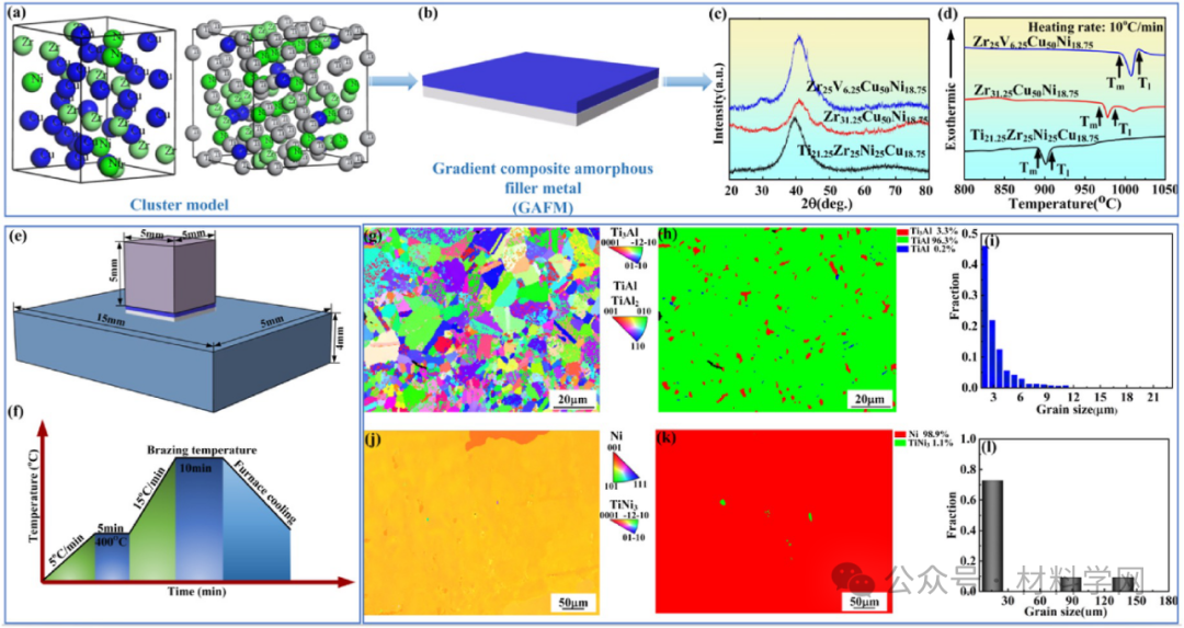 图1. (a) [Zr-Cu]和[Ti-Ni]的主要簇示意图;(b) 梯度复合非晶填充金属的示意图;(c) 梯度复合填充金属的X射线衍射(XRD)图样;(d) 梯度复合填充金属的差热分析(DTA)曲线;(e) TiAl/(Ti21.25Zr25Ni25Cu18.75/Zr31.25-XVXCu50Ni18.75)/K4169钎焊接头组件;(f) 钎焊过程路线的示意图;(g) TiAl金属间化合物的反极图(IPF)图;(h) TiAl金属间化合物的相图;(i) TiAl基底中晶粒尺寸的分布图;(j) K4169合金的IPF图;(k) K4169合金的相图;(l) K4169合金中晶粒尺寸的分布图。