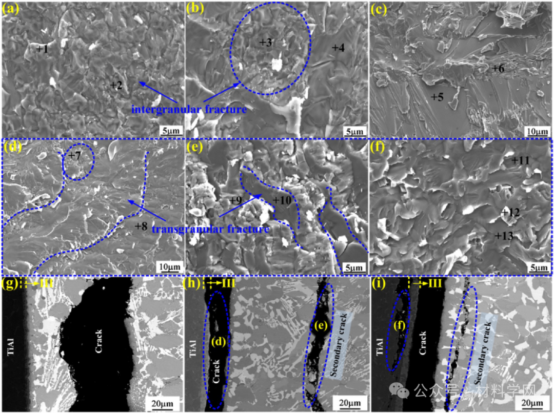 图19. K4169/TiAl钎焊接头的断口表面:(a–c) 在1040°C/10分钟下采用(Ti21.25Zr25Ni25Cu18.75/Zr31.25Cu50Ni18.75)钎焊的K4169/(Ti21.25Zr25Ni25Cu18.75/Zr31.25Cu50Ni18.75)/TiAl接头的断口表面;(d–f) 在1100°C/10分钟下采用(Ti21.25Zr25Ni25Cu18.75/Zr25V6.25Cu50Ni18.75)钎焊的K4169/(Ti21.25Zr25Ni25Cu18.75/Zr25V6.25Cu50Ni18.75)/TiAl接头的断口表面;使用Ti21.25Zr25Ni25Cu18.75/Zr25V6.25Cu50Ni18.75 GAFM钎焊的K4169/TiAl接头在1100°C/10分钟的断裂路径:(g) 裂纹起始位置的断裂路径图;(h) 区域II/III界面裂纹传播的断裂路径图;(i) 裂纹传播进入TiAl基体的断裂路径图。
