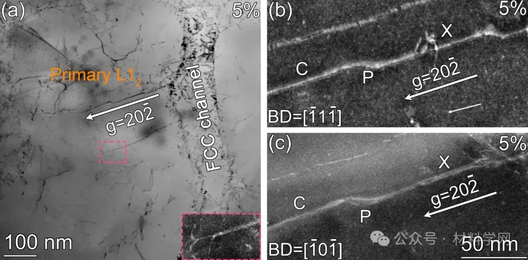 图7 在700 °C变形量为5%样品中所观察到的超晶格位错的交滑移现象